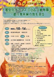 会員:2,500円 非会員:3,000円 (史跡説明資料・小石川植物園入館料・傳通院説明書・記念写真代込 ) – 18歳~22歳未満:半額 ※懇親会費は含まれません。 |