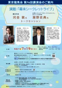 今回の講演会は歴史作家の河合敦氏、お笑いコンビ「ブロードキャスト!!」のツッコミ担当の房野史典氏をお招きして、トークセッション (演題「幕末シークレットライブ」)を頂きます。当日は書籍の販売も予定しております。