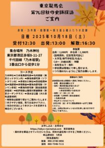 | 会 場 | ・会 場:屋台居酒屋えびす ・住 所:東京都港区赤坂3-18-17 PANJAPANビル2F ※赤坂見附駅から徒歩2分 ※史跡探訪へご参加の方は解散後、一緒にご案内いたします。 時 間:17:00~19:00 参加費:5,000円(飲み放題付き) ※先着25名まで(史跡探訪参加者優先) ※懇親会をキャンセルをされる方は申し込みをいただいた際にお伝えした緊急連絡先へ必ずご連絡をください。 10月11日(土)以降はキャンセル代を申し受けます。あらかじめご了承ください。 ※地図と緊急連絡先はページ上部へ添付の案内状(PDF)内に記載されています。 |
